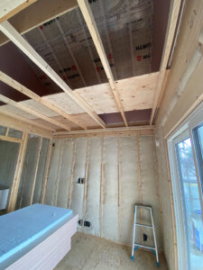 2階リビング 吹抜のあるお家 11月26日〜11月27日にかけて、国産桧の2×4パネル工法にて、無事にルーフィング工事まで完了いたしました。 2日で上棟し、上棟後に水切りシートや透湿防水シートとサッシを取り付けを施し、第…続きを読む