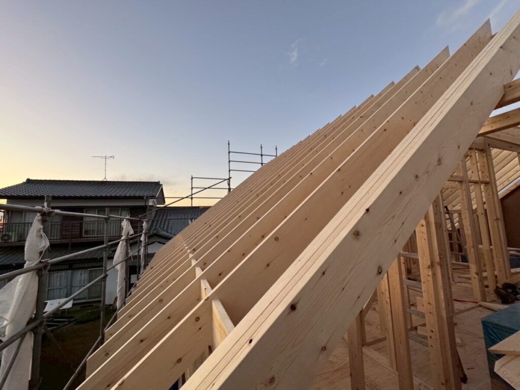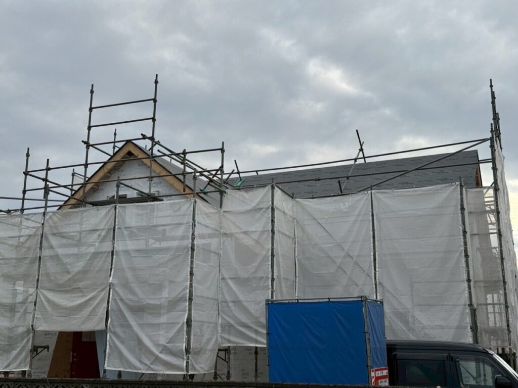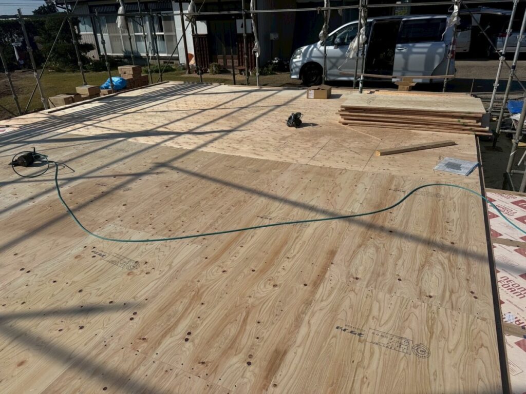 11月17日〜11月19日かけて、現場状況に応じたパネル工法と一部プレカットにて、無事にルーフィング工事完了いたしました。