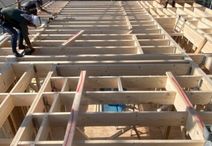 2階リビング 吹抜のあるお家 11月26日〜11月27日にかけて、国産桧の2×4パネル工法にて、無事にルーフィング工事まで完了いたしました。 2日で上棟し、上棟後に水切りシートや透湿防水シートとサッシを取り付けを施し、第…続きを読む