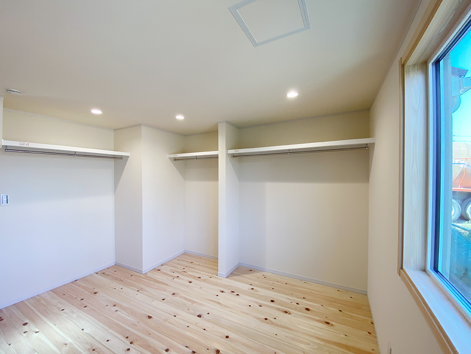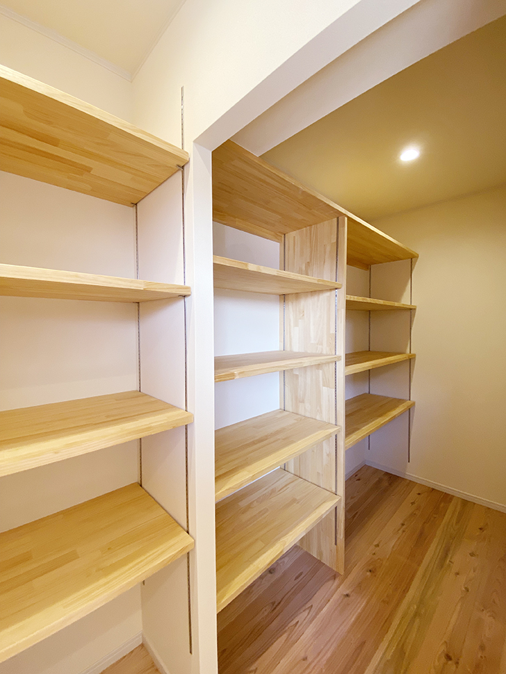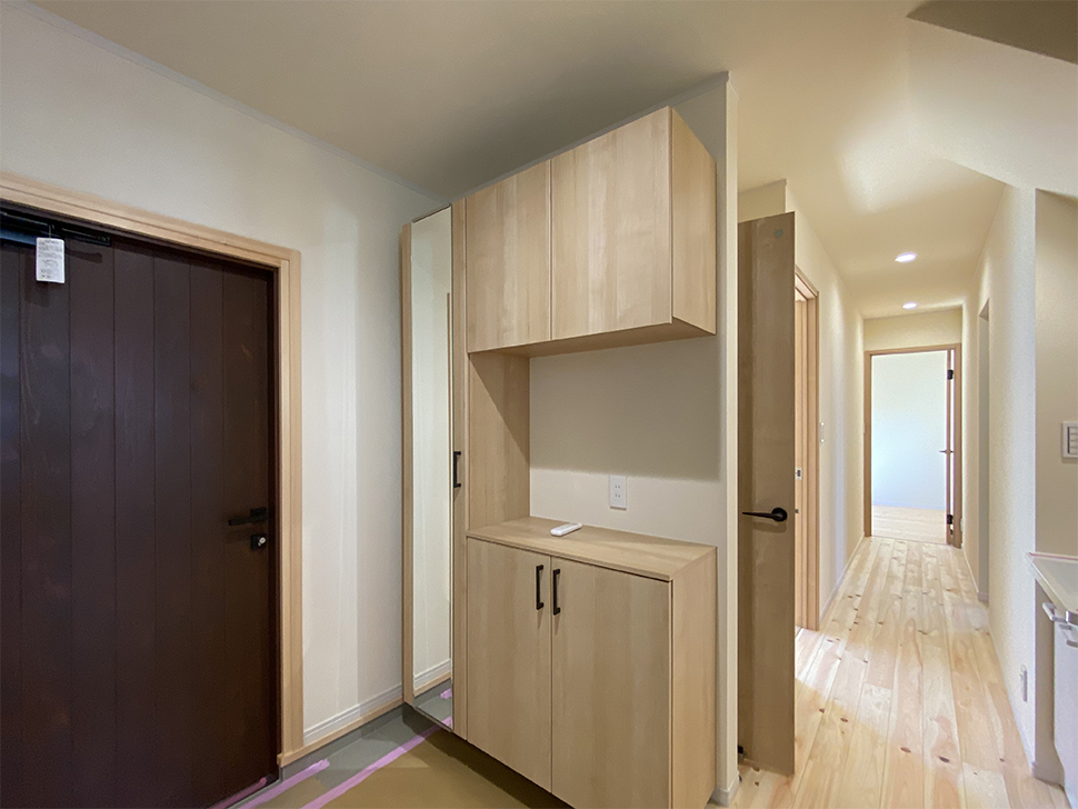 玄関近くには洗面台を設置。 1階には各居室と広い収納のあるお部屋、ホビールームが並びます。