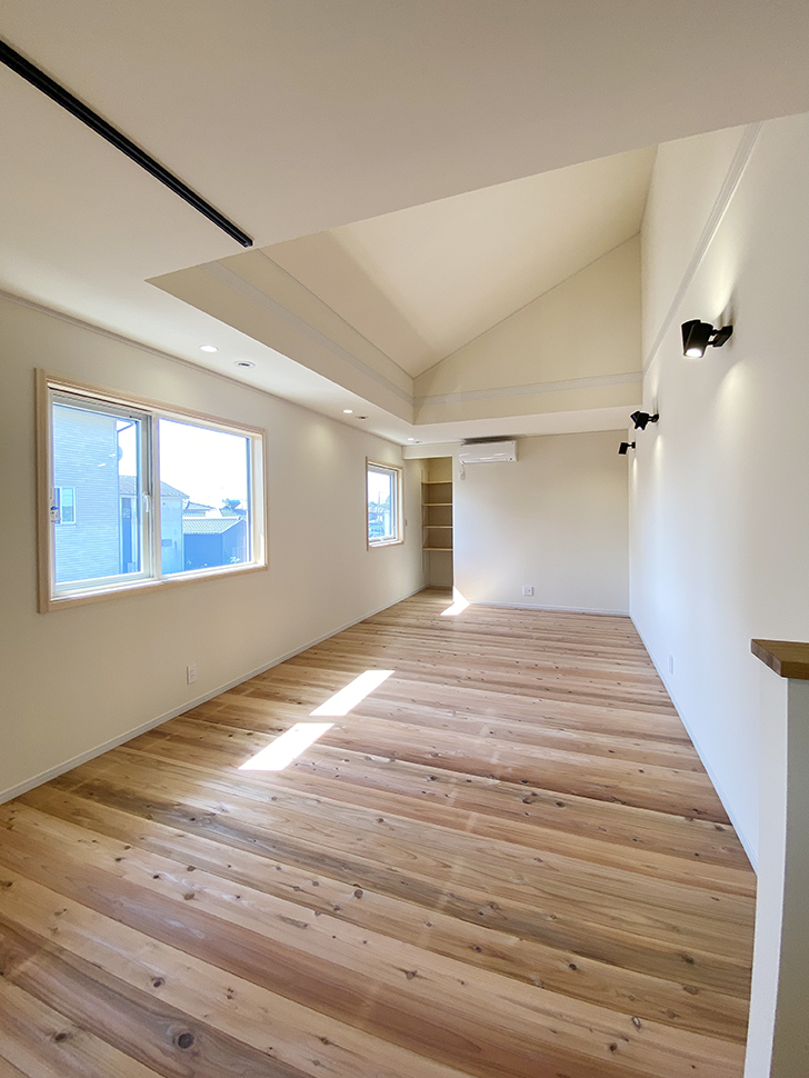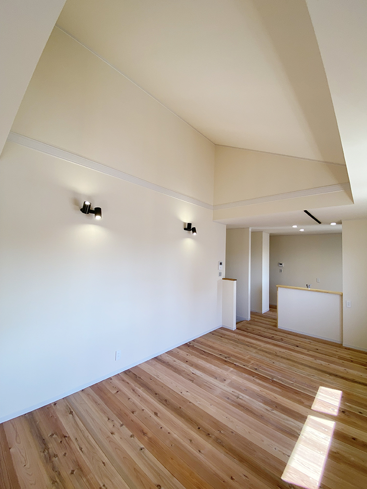 お二階には、屋根形状を生かした天井の高いLDKが。