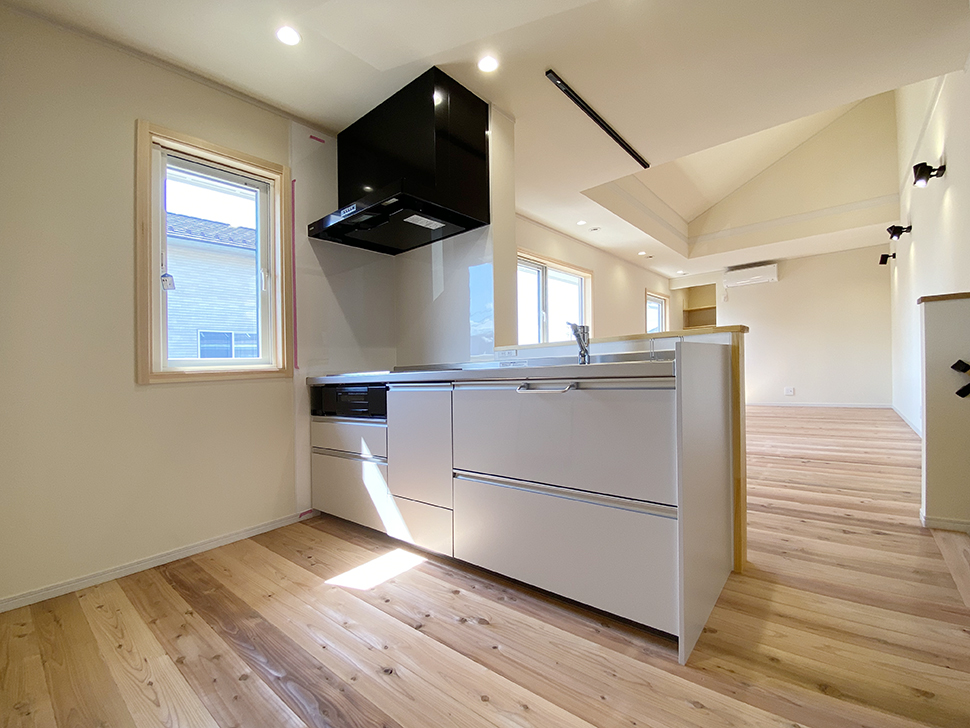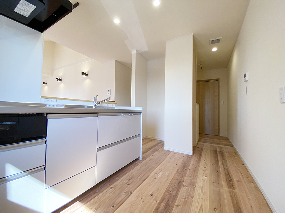 LDK全体を見渡せる明るいキッチン。 キッチン奥に水廻りをまとめ、すっきりとしたデザインに。
