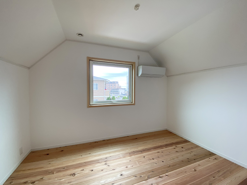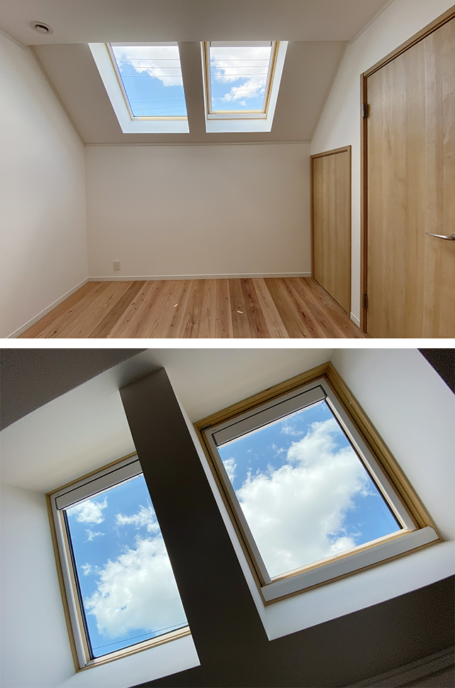 屋根形状を生かした天井がかわいいお部屋。 二つ並んだ天窓からは空に手が届きそう。