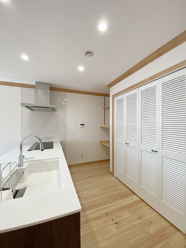 キッチン背面には隠せる収納。コンロ側には造り付けの棚も。 また、冷蔵庫側の壁はマグネットをつけることができます。