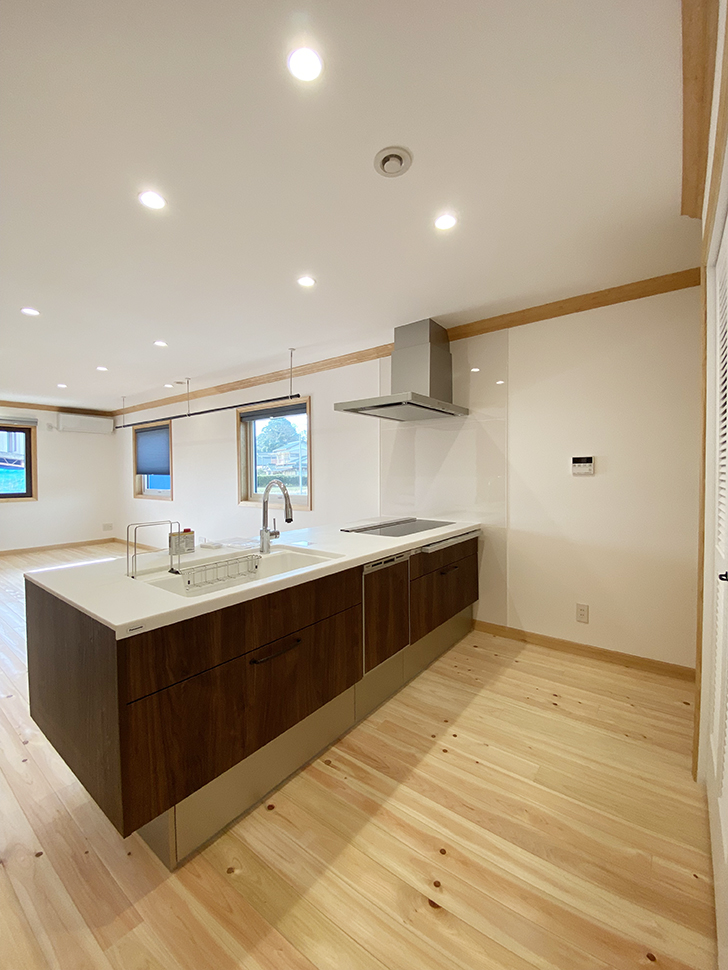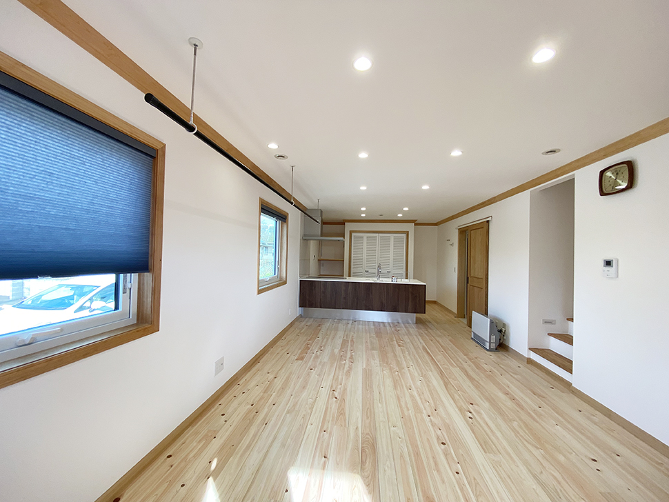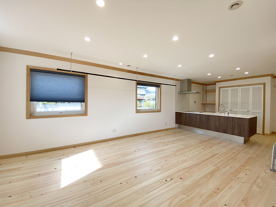 自然素材である桧無垢材の床があたたかな、広いLDK。