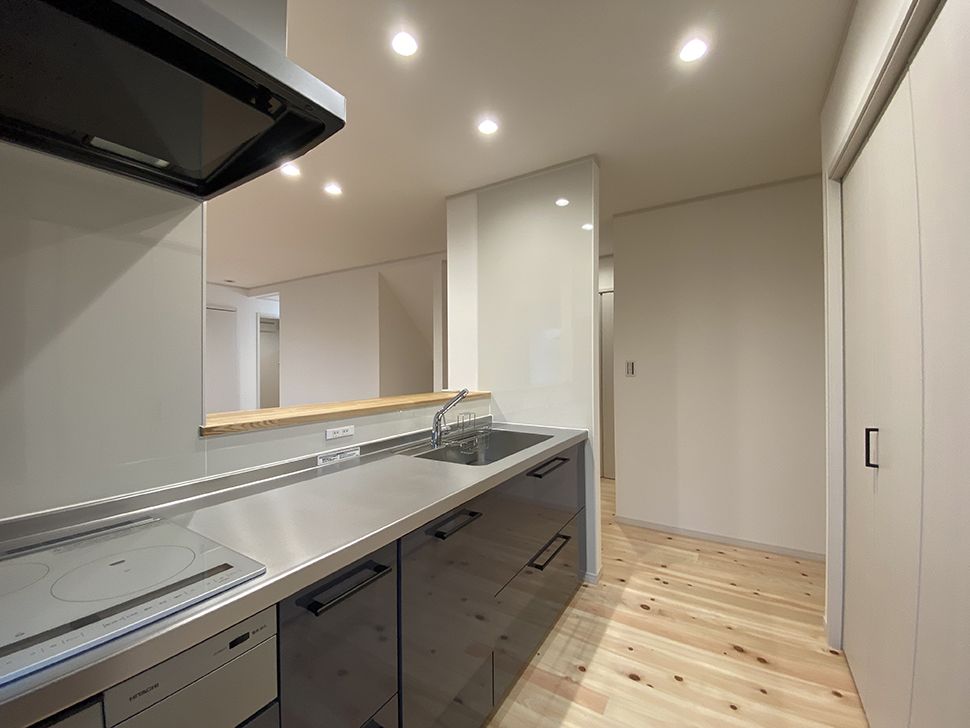 オールステンレスのスタイリッシュな天板で仕上げたキッチン。 シンク横にはさりげない目隠しを設置して生活感をそっと隠します。