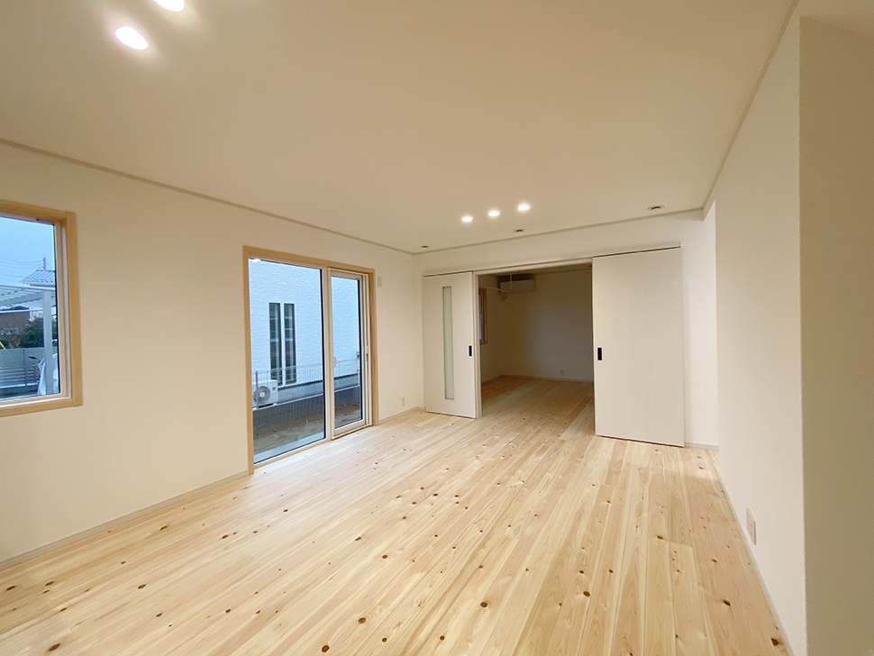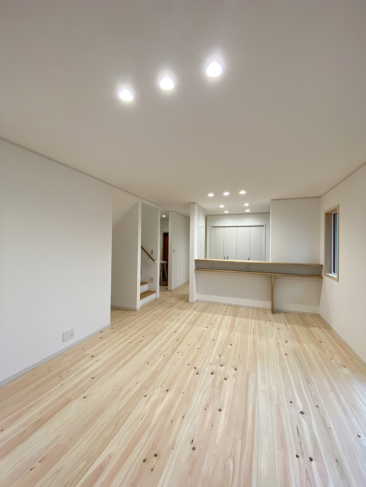 桧の縁甲板と白いクロスでナチュラルに仕上げたLDK。