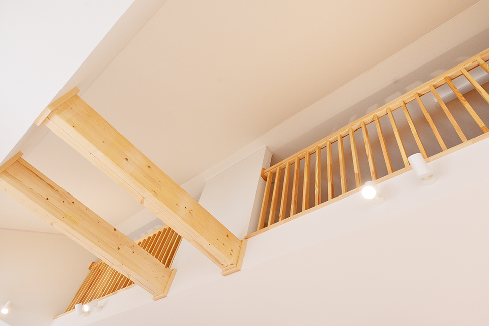 屋根勾配を生かした高い天井はあらわしの梁が素敵です。