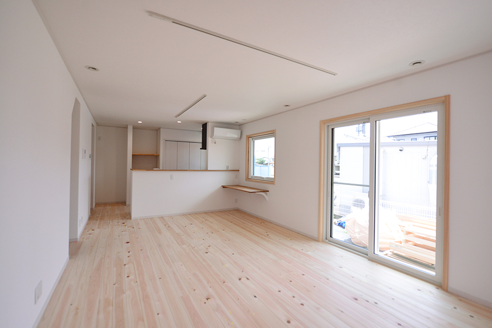 あたたかみのある自然素材の床と白壁のナチュラルなLDK。