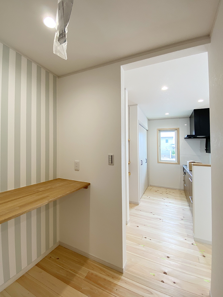 キッチン奥にはアクセントクロスが楽しい作業スペースも。
