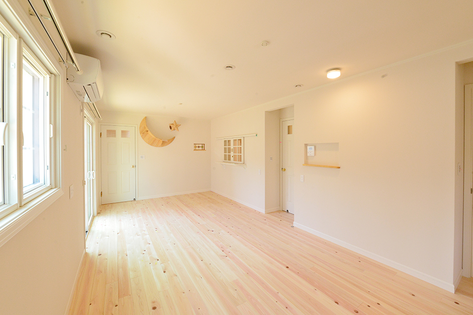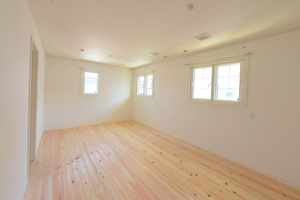 将来的に仕切って使える子供室と、アクセントクロスで変化を楽しむ主寝室。