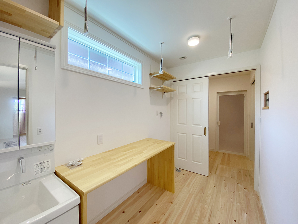 天井付近に設えた明かり取りの窓でとても明るい洗面脱衣室。