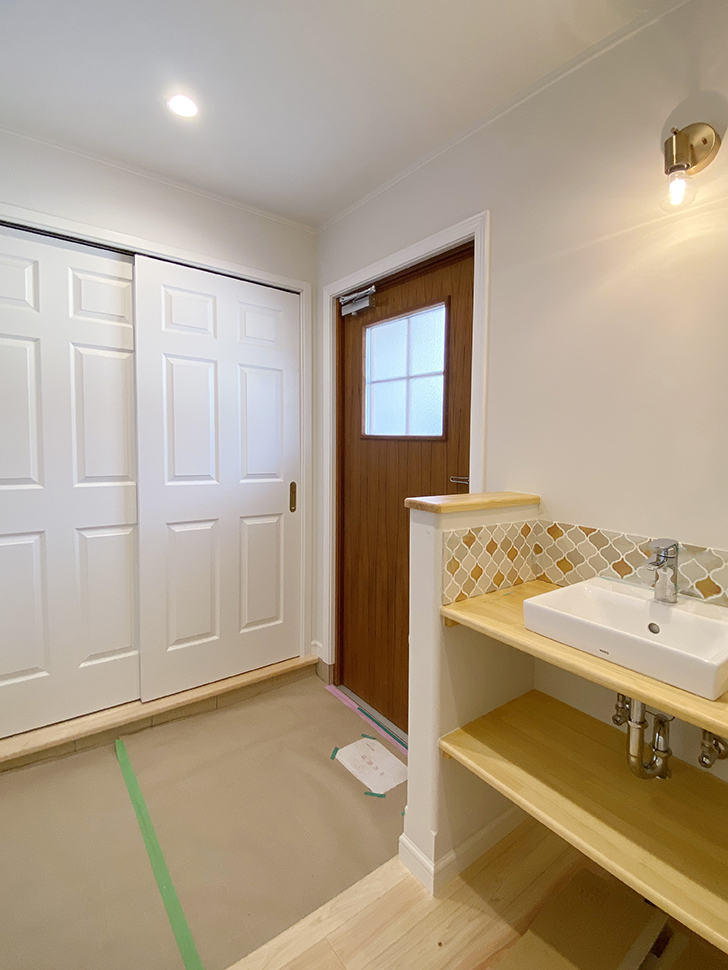 玄関ホールには、タイルに囲まれたかわいい洗面コーナーを設置しました。