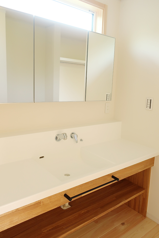 シンプルな洗面台には造り付けの棚をつけました。