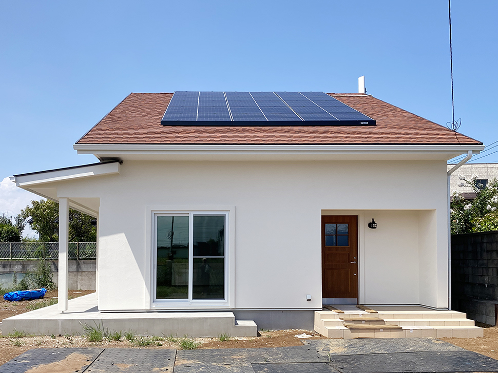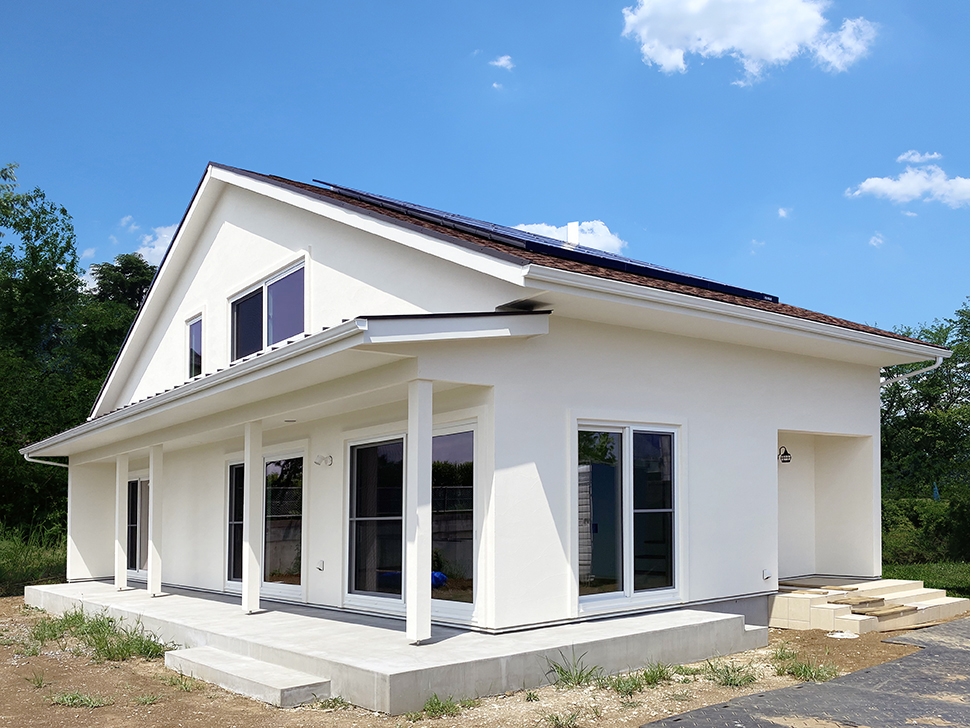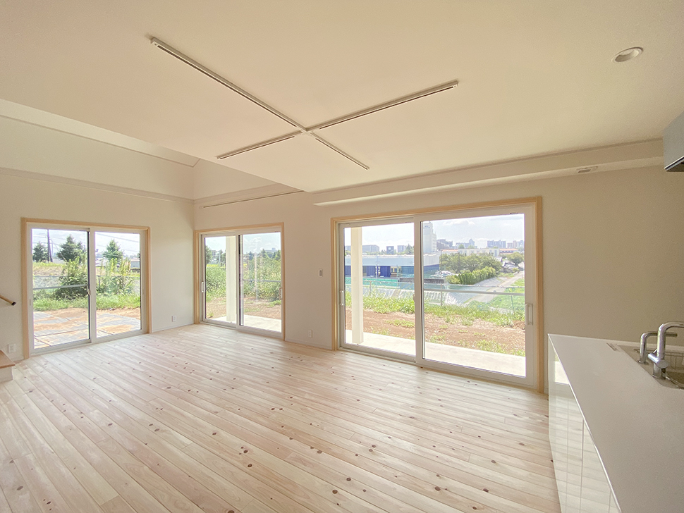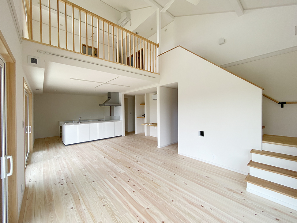 大きな吹き抜けと勾配天井のLDK、真っ白な塗り壁が美しいお家が完成しました。