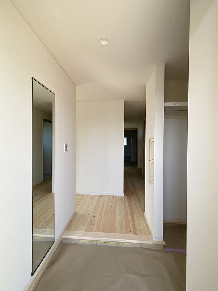 クロゼット正面に取り付けた大きなミラーでお出かけ前のチェックも万全!
