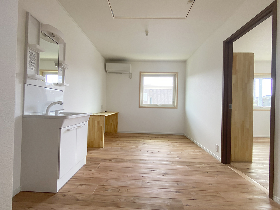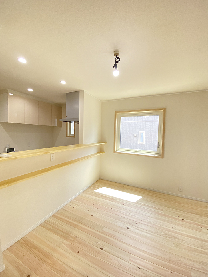 広い2階ホールには造り付けの作業台を設置。 2階の床は杉材を使用しています。