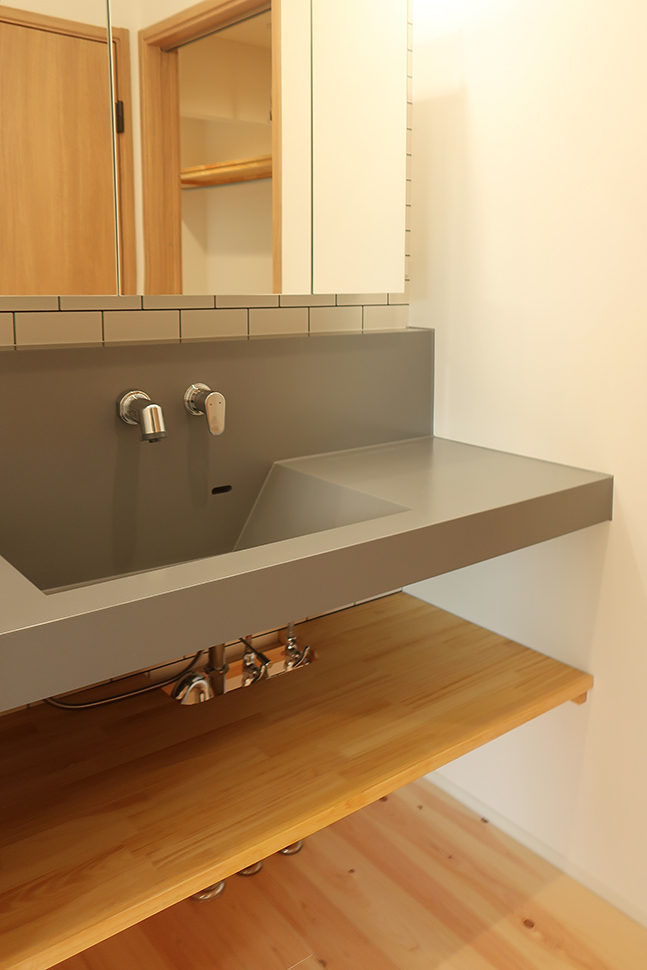足元がスッキリした洗面台に造り付けの棚を合わせました。