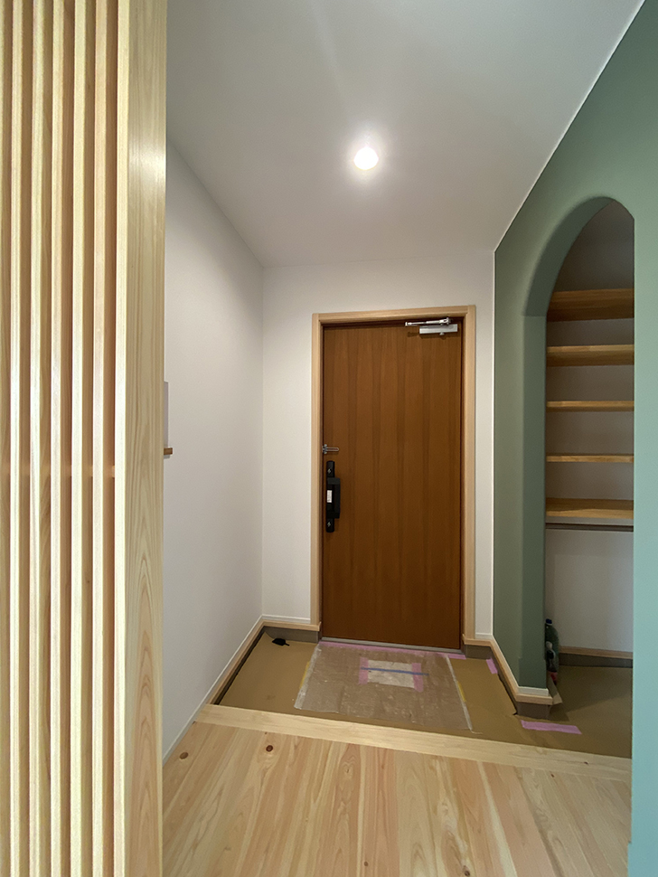 十分な収納力を備えたシューズクロゼットのある玄関には、格子の目隠しをつけました。