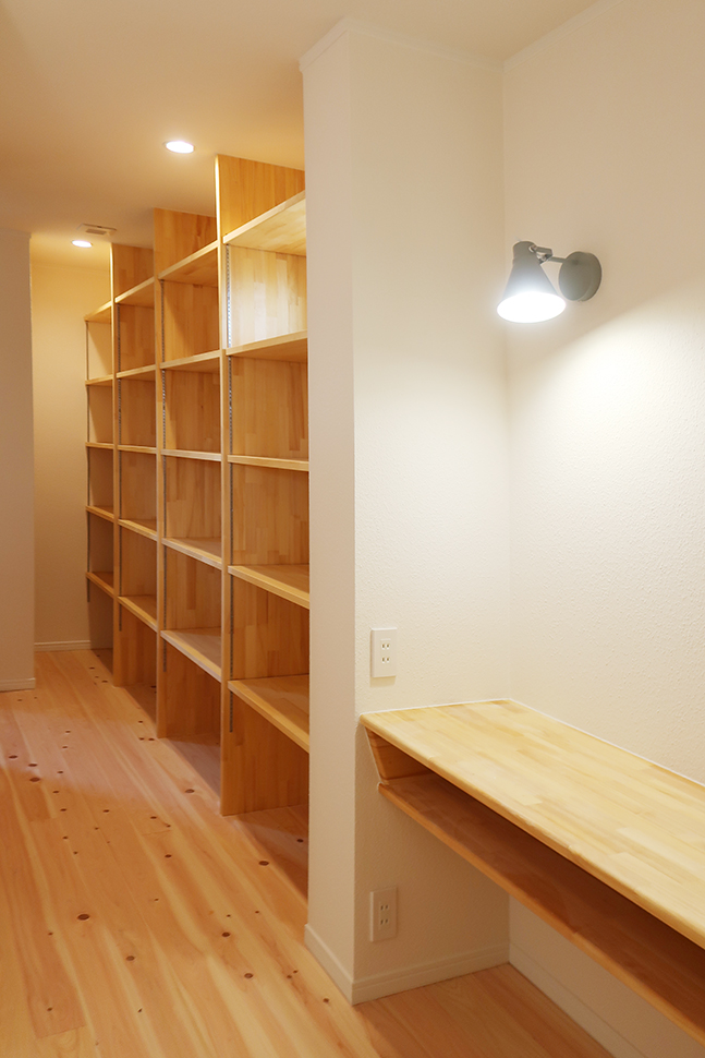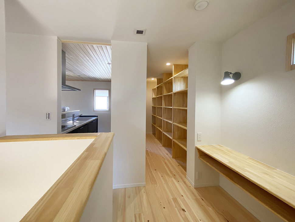 造り付けの棚でシンプルにまとめたキッチンの裏手には広いパントリー。 オープンな書斎スペースも魅力的。