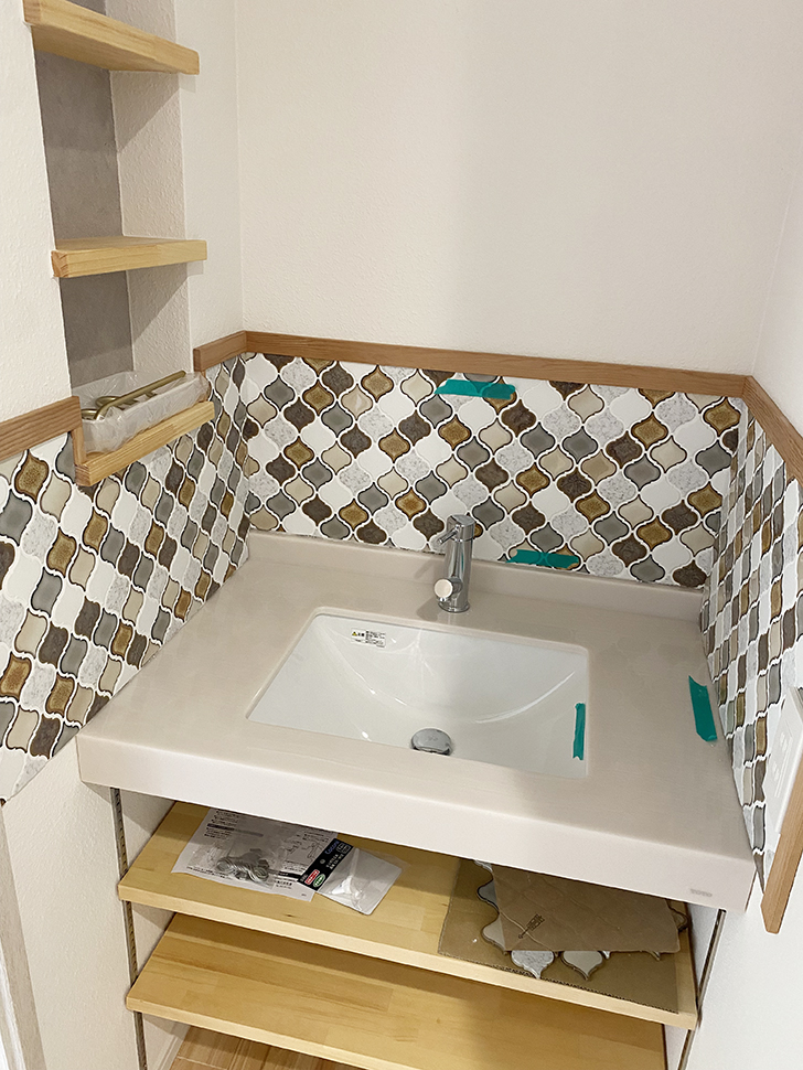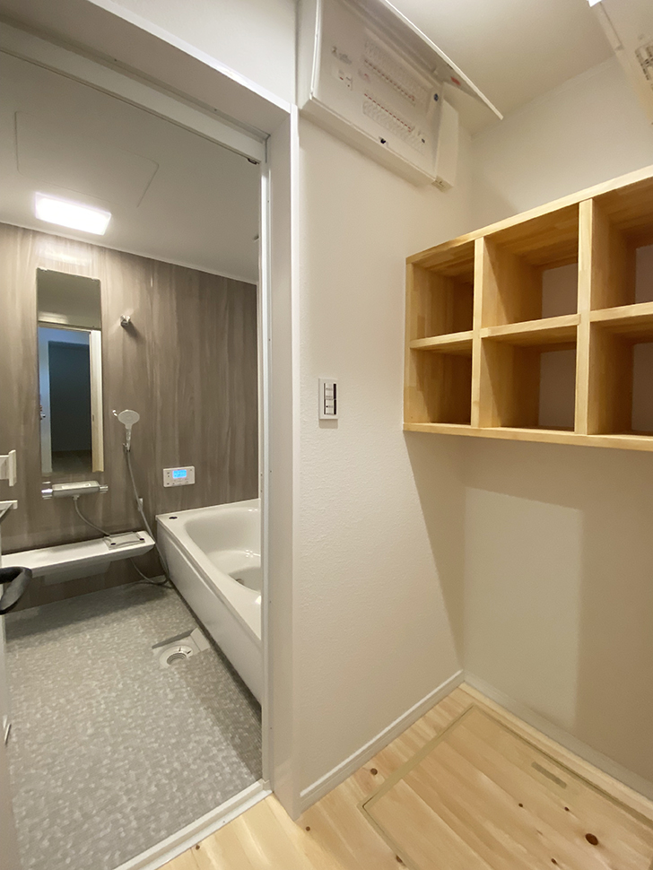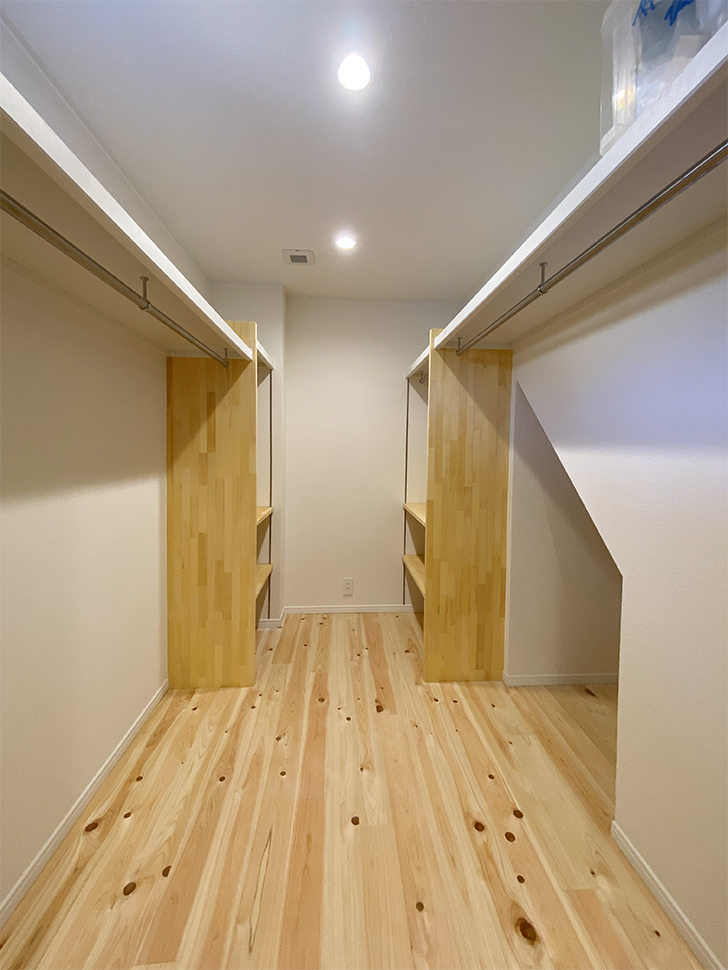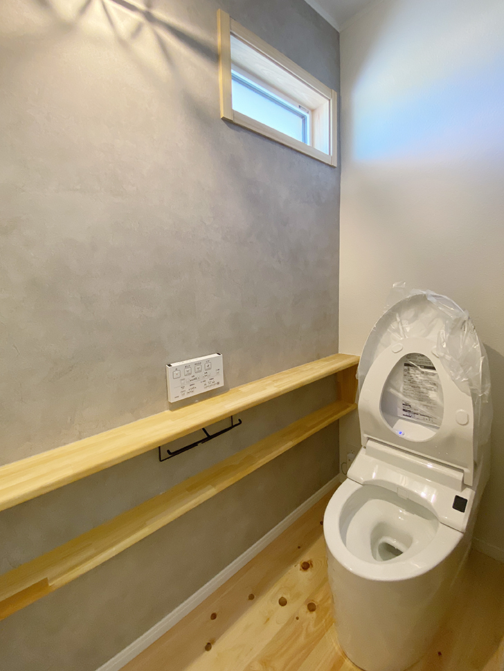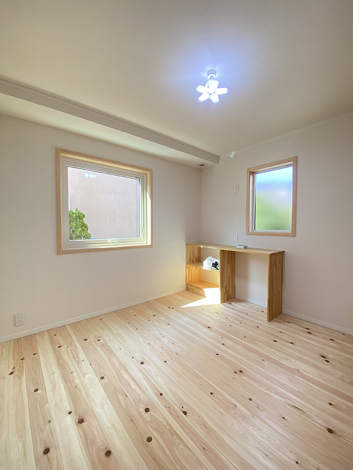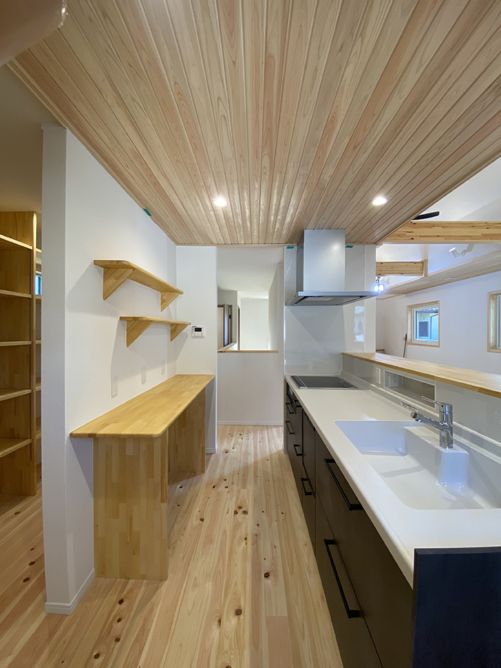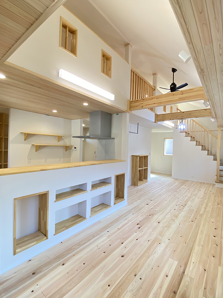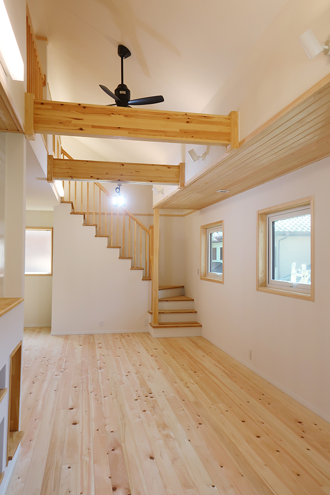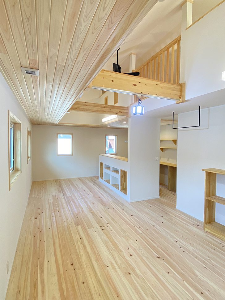 通気性・吸湿性に優れた自然素材の壁紙に漆喰ペイント、桧の床。 天井の一部にも桧を貼い、自然素材をふんだんに使ったお家です。