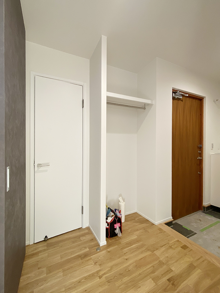 お出かけの時に上着などをさっと取れる収納を備えた玄関。