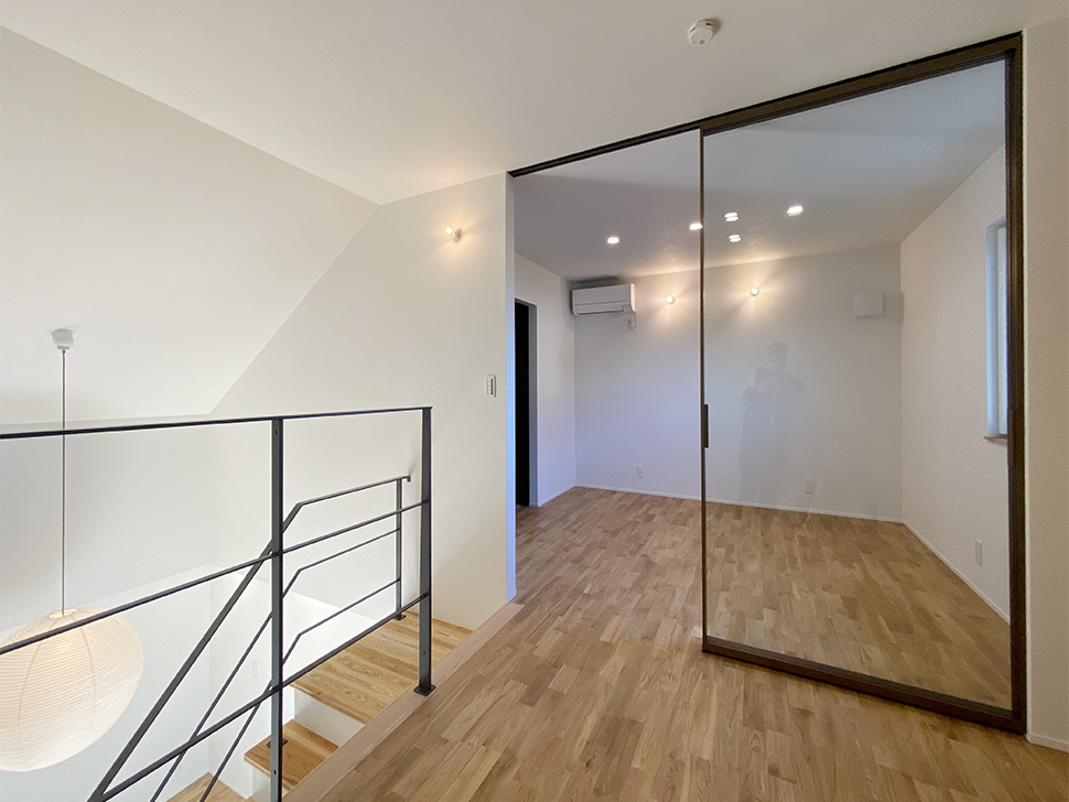 ガラスドアの間仕切り。 勾配天井の吹き抜けから2階まで、ひとつながりの空間に。
