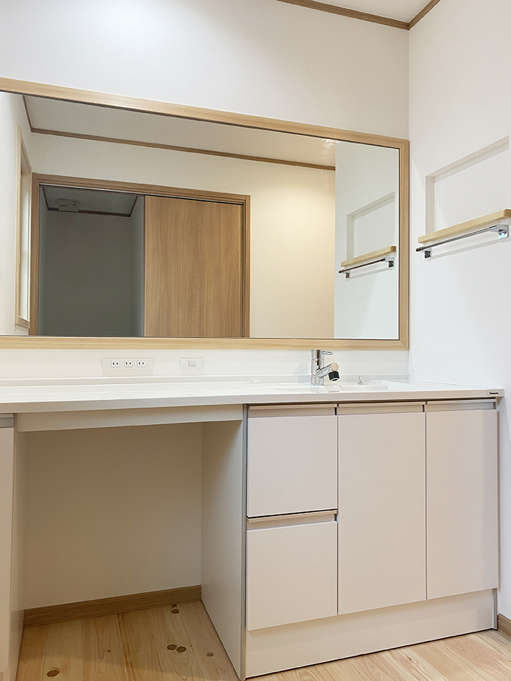 シンプルにまとめた、大きなミラーの洗面台。 作業台のある洗面室です。
