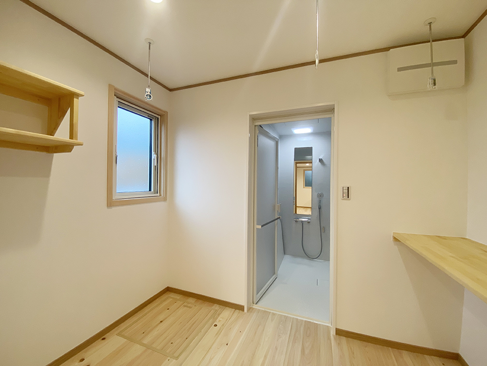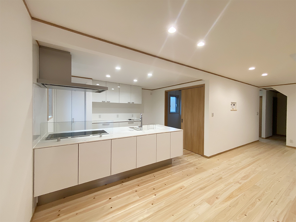 自然素材の桧の床がやさしいLDK。ナチュラルな木目に白い壁の落ち着いた空間です。