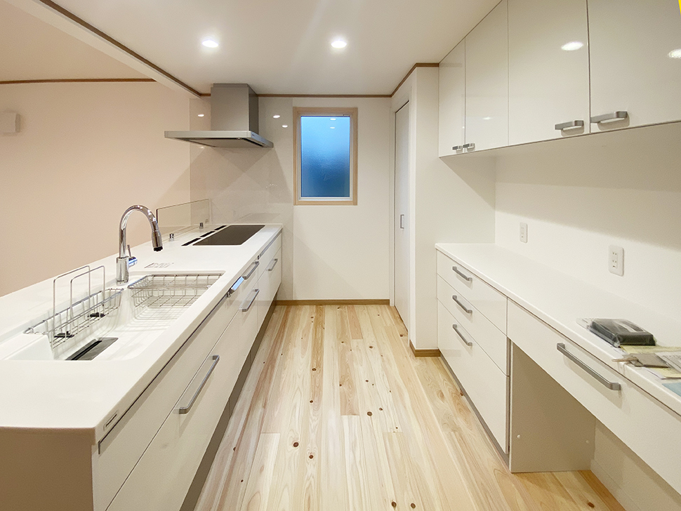 清潔感のある真っ白なキッチン&カップボード。