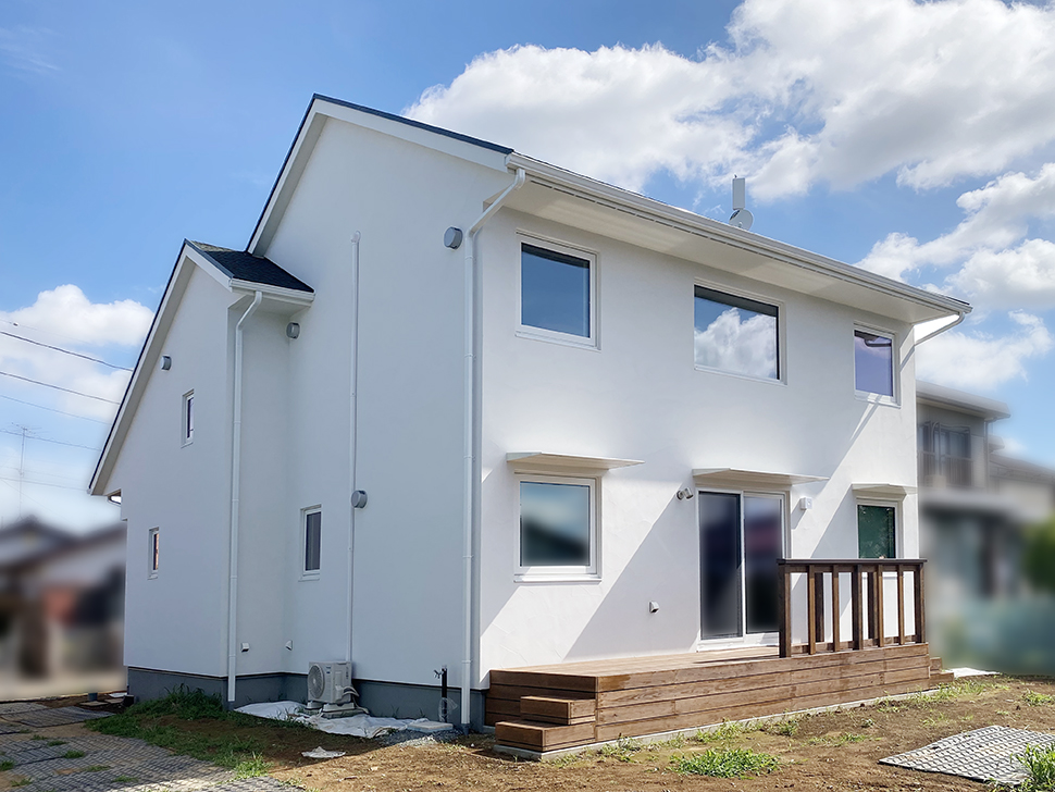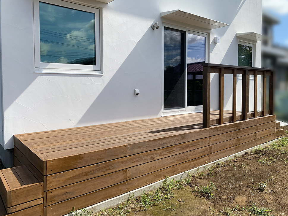 リビングに面するお庭側にもウッドデッキを。