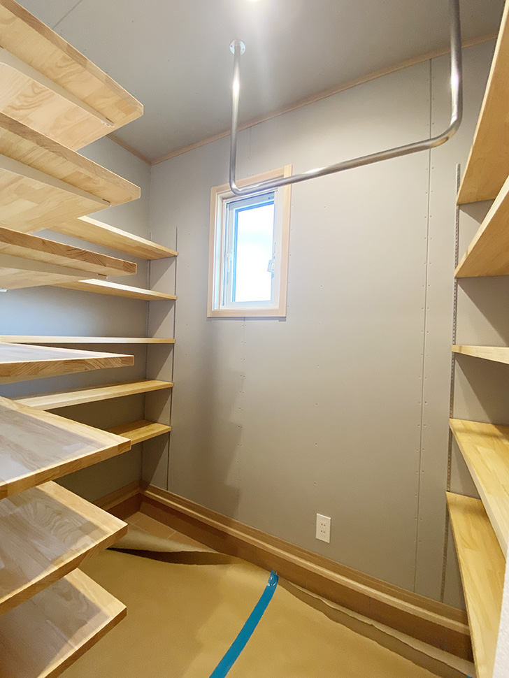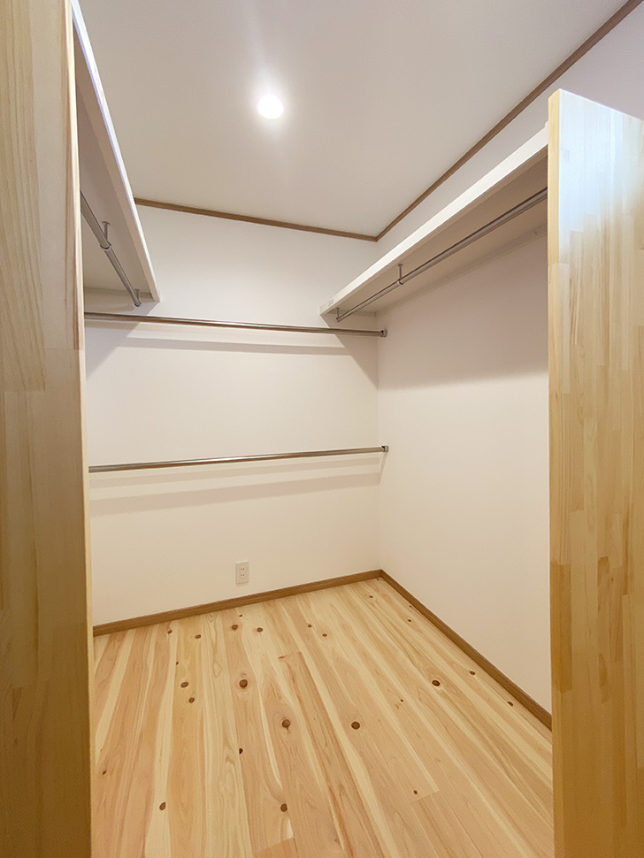 広いウォークインクロゼットはポールの位置や本数を工夫して使いやすく。