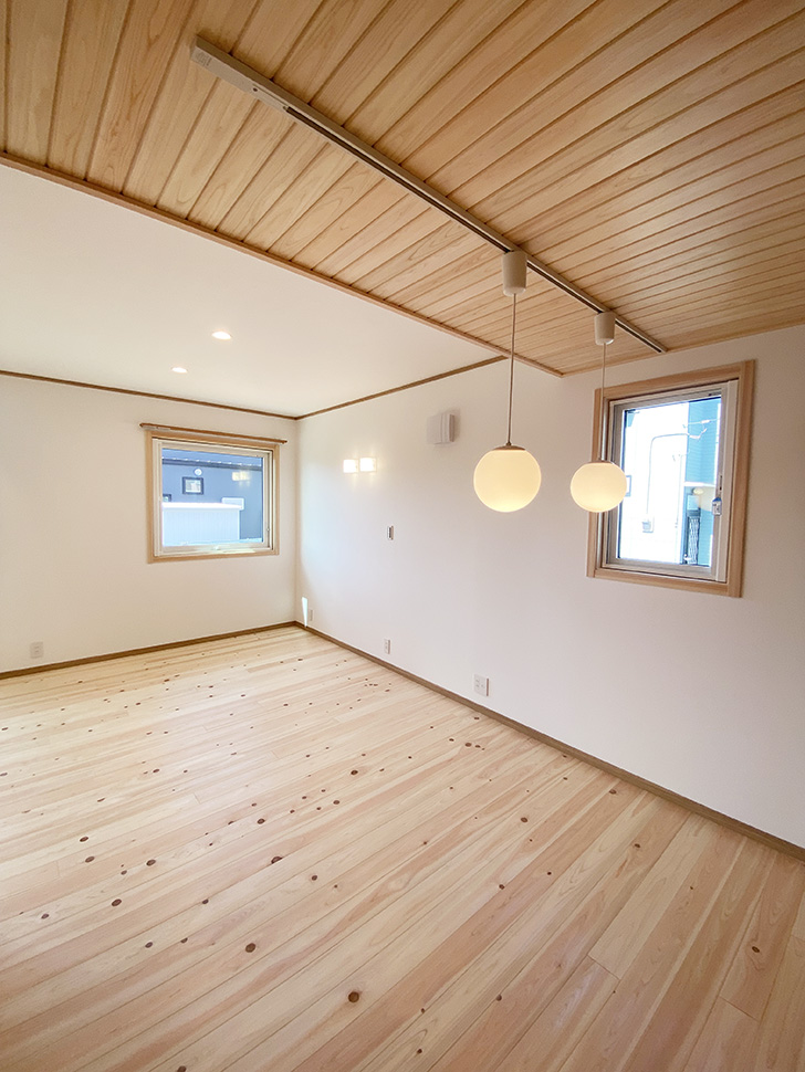 屋根勾配を生かした、天井の高い主寝室。