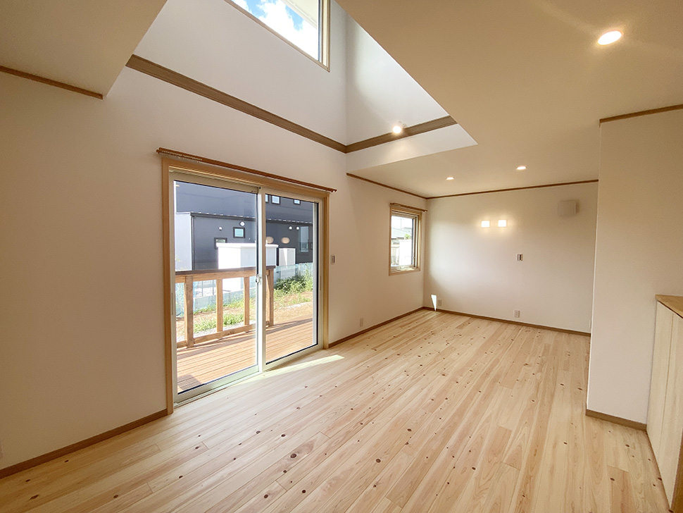 南側の窓に面した吹き抜け、掃き出し窓の向こうにはウッドデッキと、奥行きのある室内です。