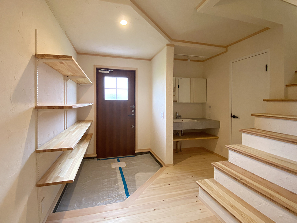 オープンなシューズラックと広めの土間ですっきりと仕上げた玄関。