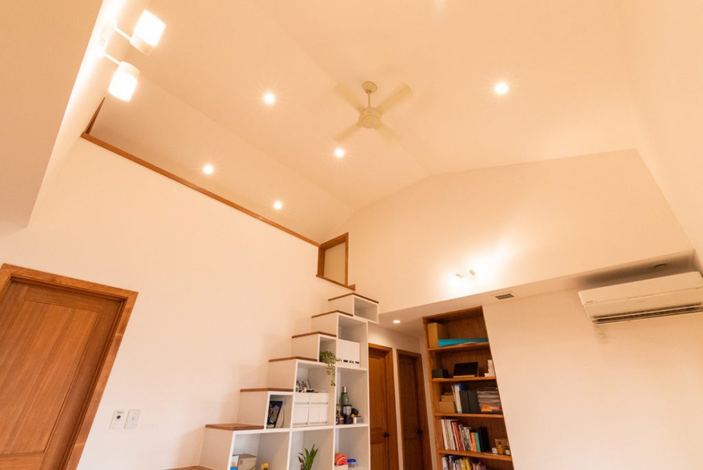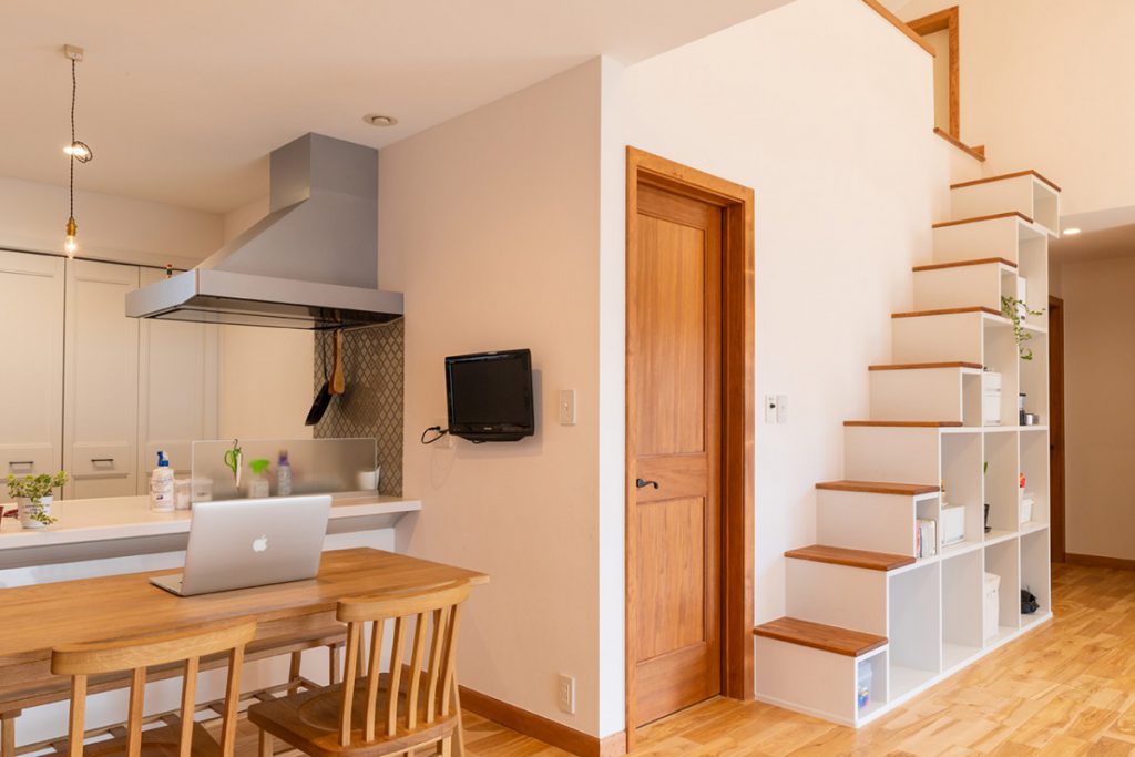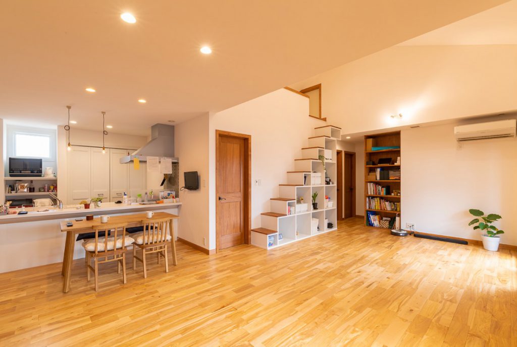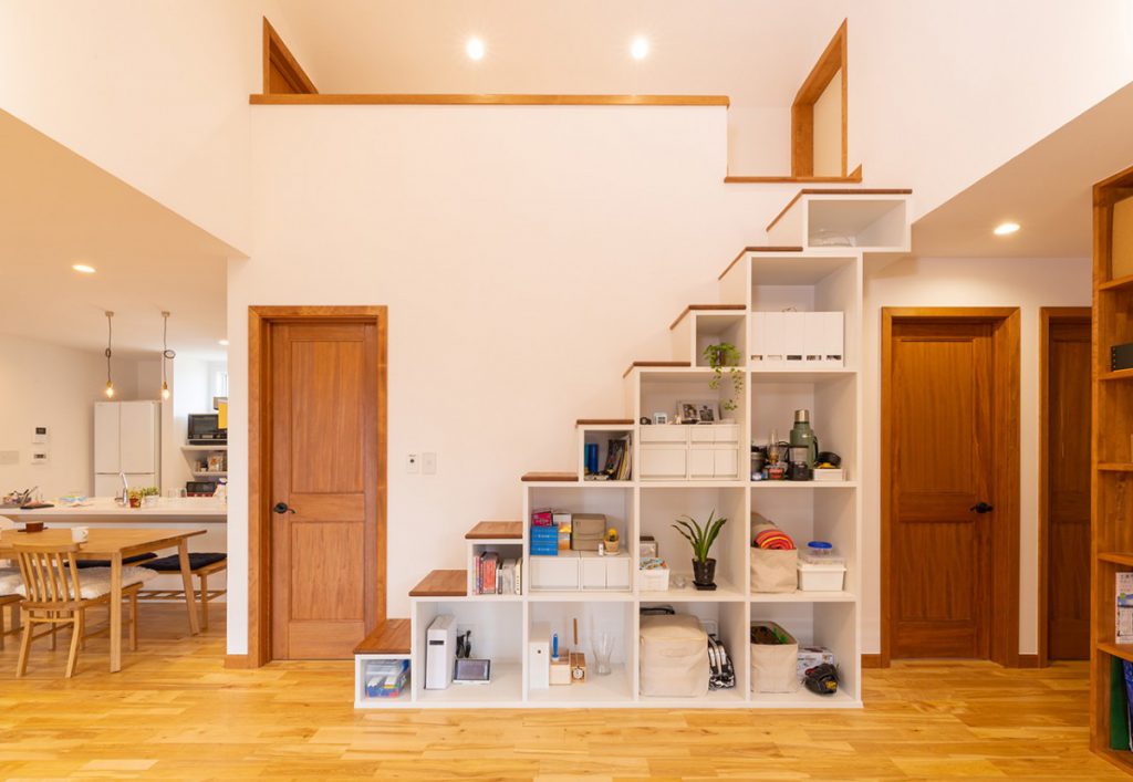 リビングには見せる収納の階段と、勾配天井を活かした広いロフト。