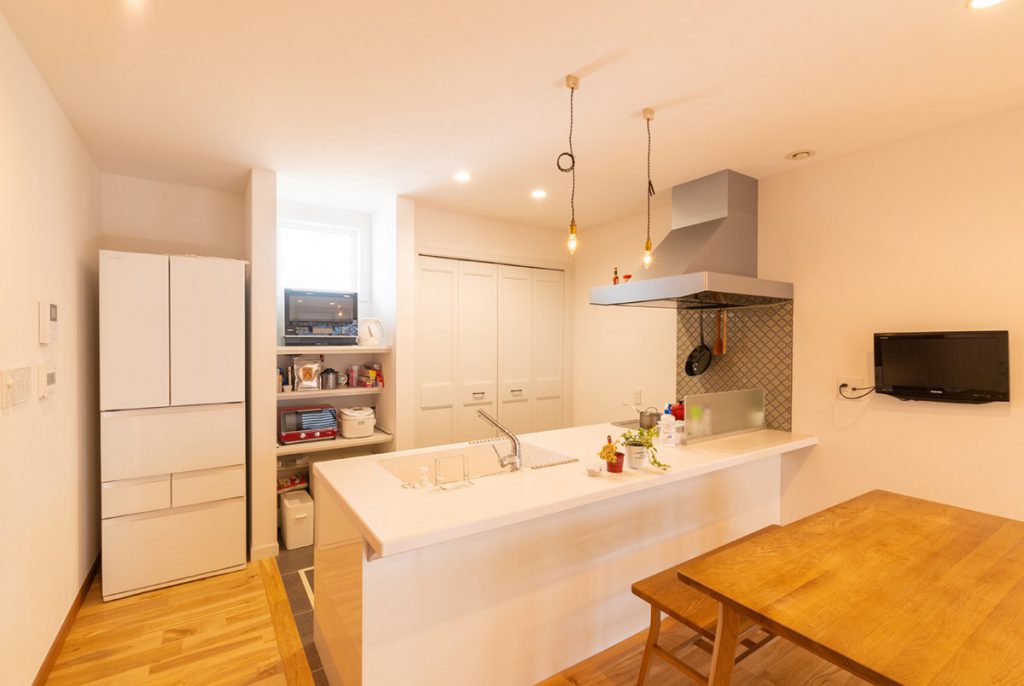 大きな空間を分断することなく、きれいにまとめられたキッチンには、リビング側からは見えづらい配慮も。