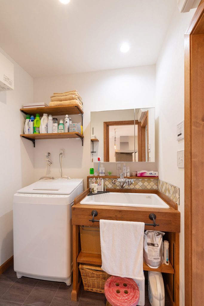 おしゃれなタイルを配した洗面台と、手洗いボウルと配管が素敵なトイレ。