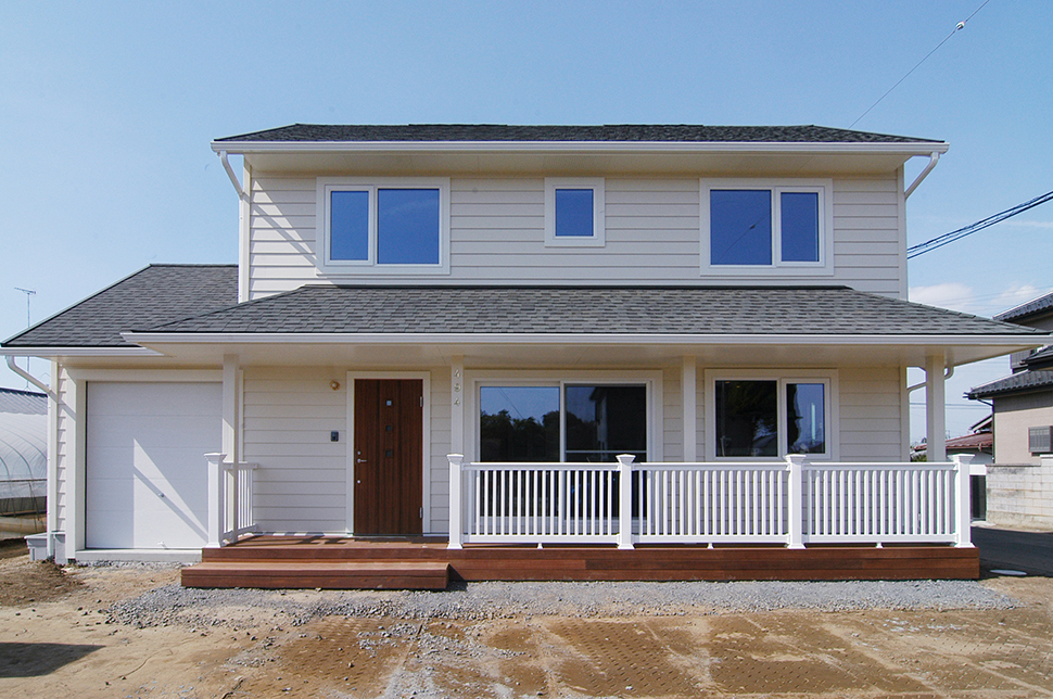 爽やかな白いラップサイディングのアメリカン住宅。