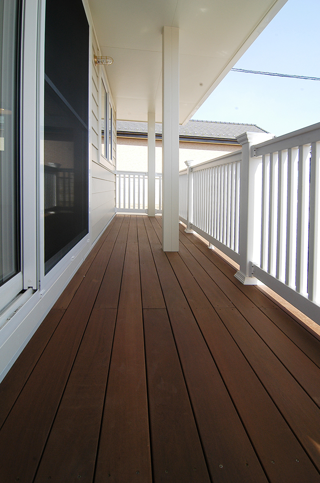 深い軒の下には広々としたカバードポーチ。玄関横には家の中からも出入り可能なバイクガレージを備える。