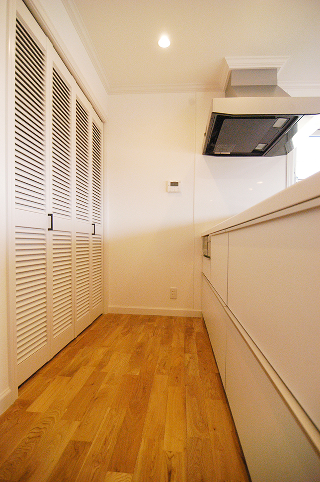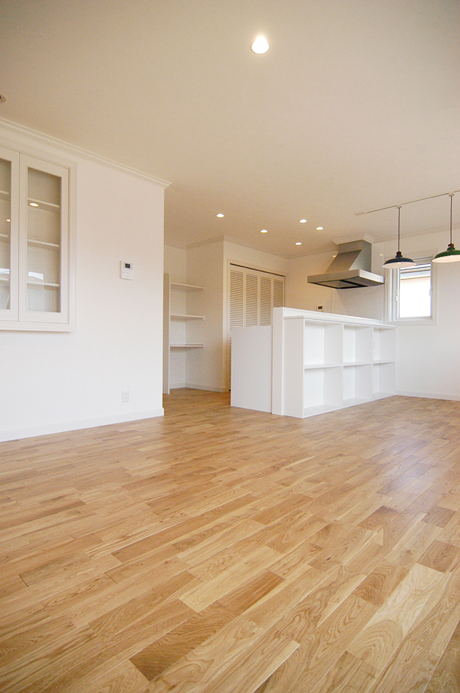 作り付けの棚が違和感なく馴染み、広い空間をさりげなく演出する。
