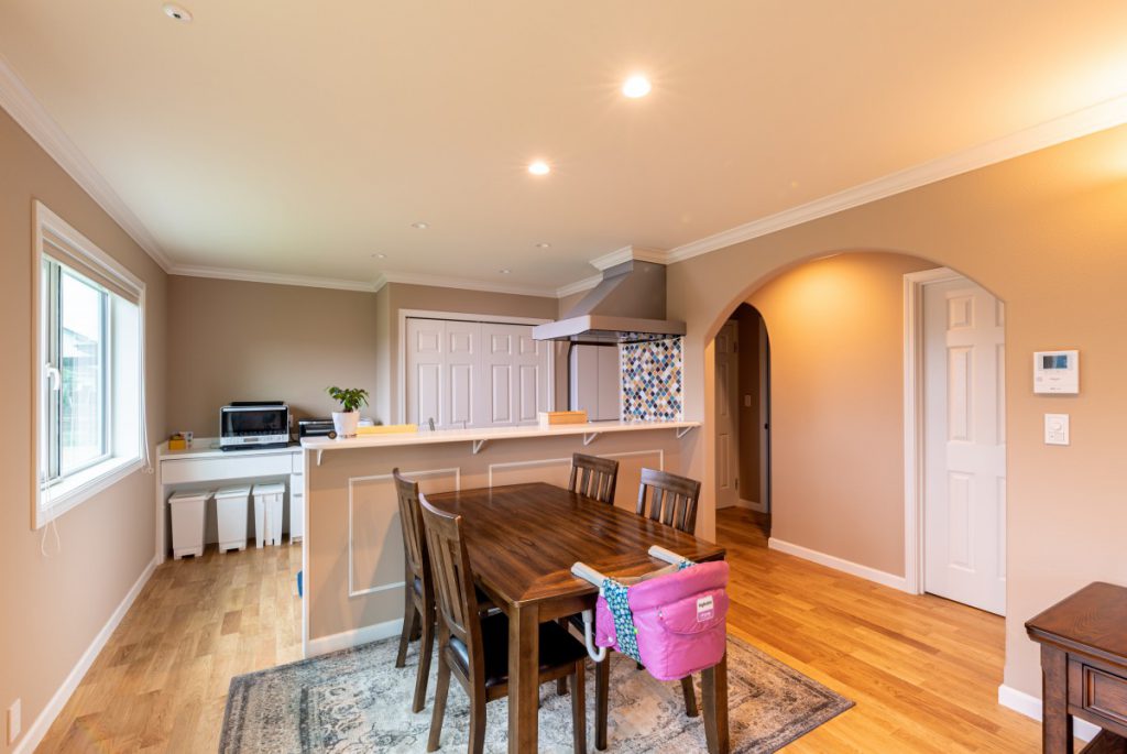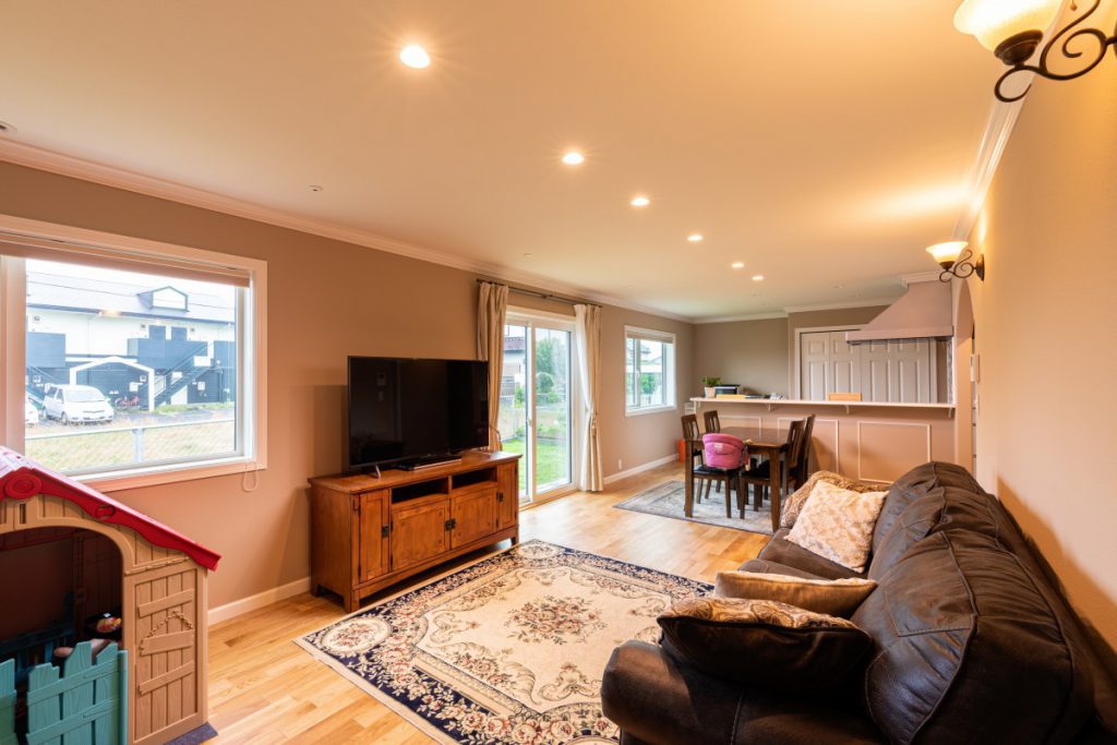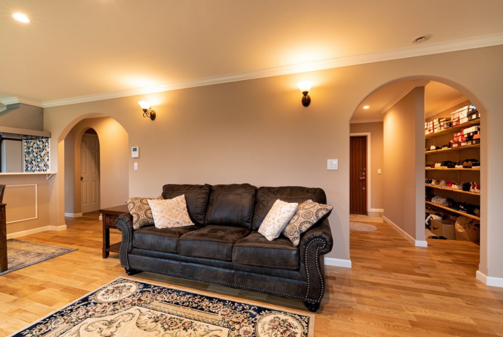 南側の大きな窓からは光がたっぷり入る明るいリビング。ドライウォールの内壁とアーチの垂れ壁がとても可愛く、アメリカンな印象のお家。