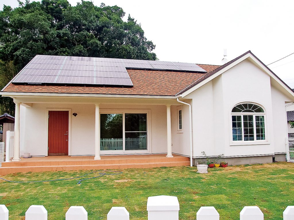 真っ白な塗り壁と深い軒、アーチ窓が印象的な、自然素材をふんだんに使用したお家。ダブル断熱で省エネ性能も抜群です。