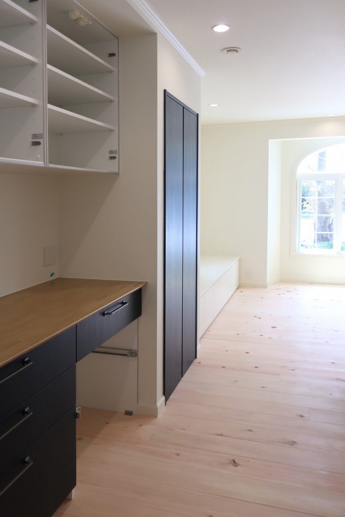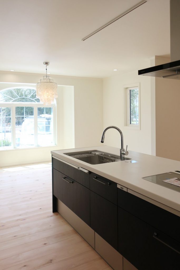 大きなアーチ型の窓がとても明るいダイニングと、収納力抜群のキッチン。
