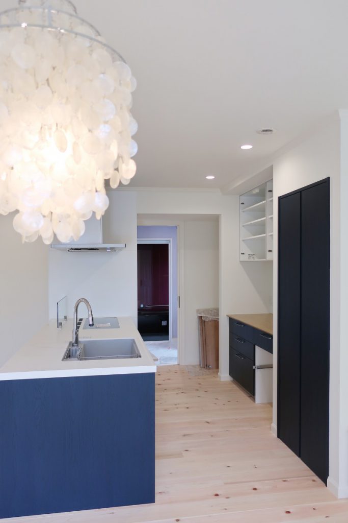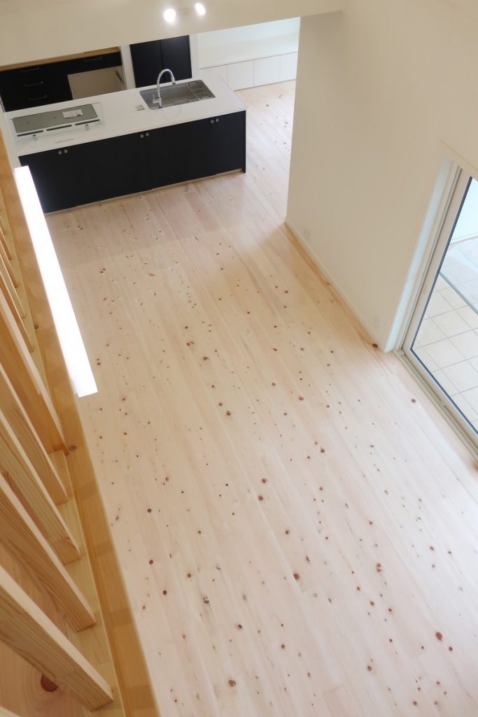 吹き抜けを生かした大空間が心地よいリビング。桧の床材、羊毛ウールの断熱材を使用し、自然素材のあたたかさを感じられるお家です。