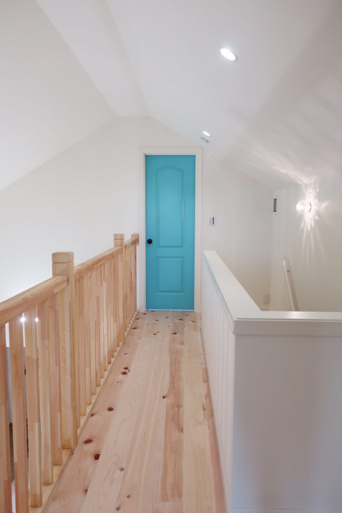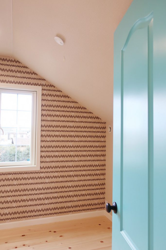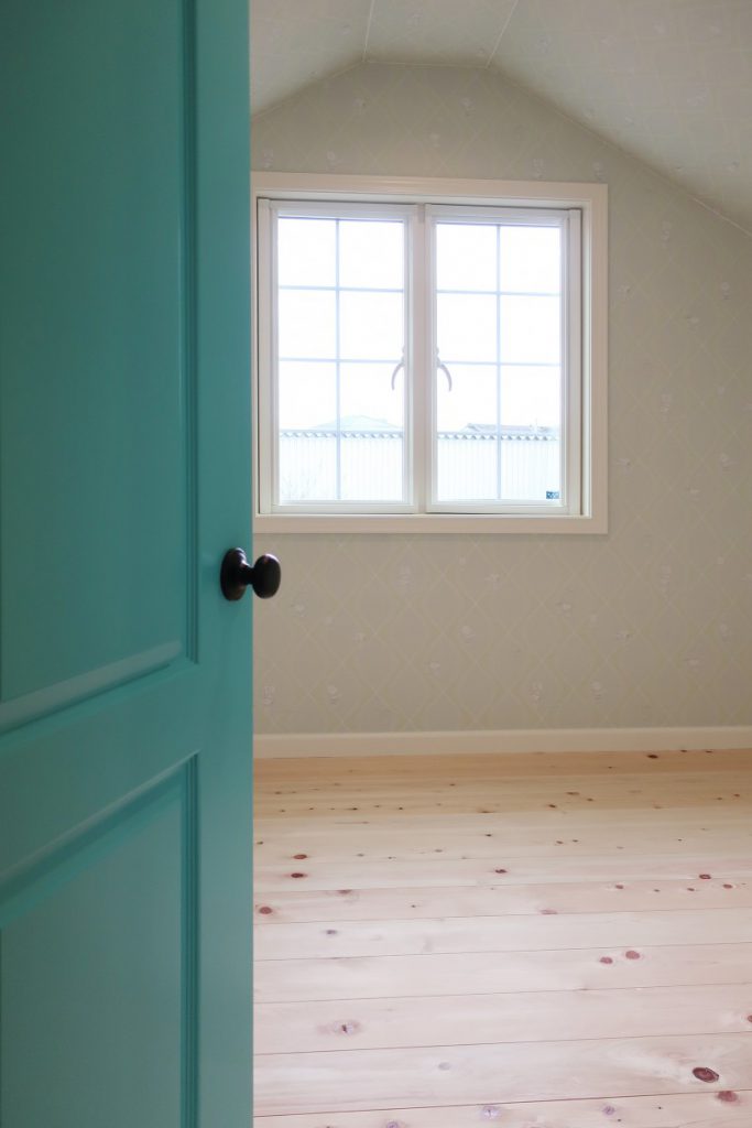可愛い色のドアの向こうには、屋根勾配を生かした不思議な空間。