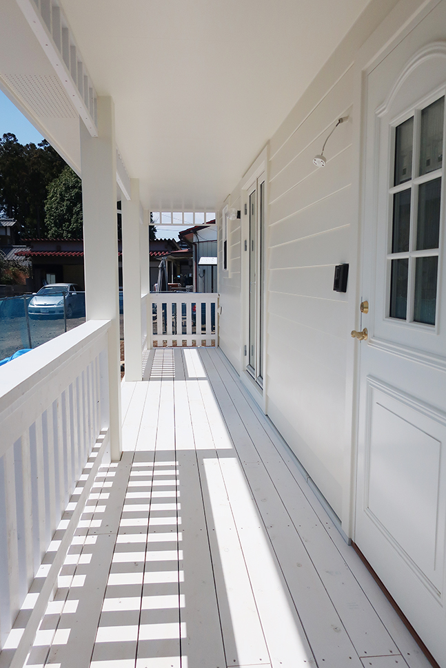 真っ白なラップサイディングと広いカバードポーチが目を引くアメリカン住宅。
