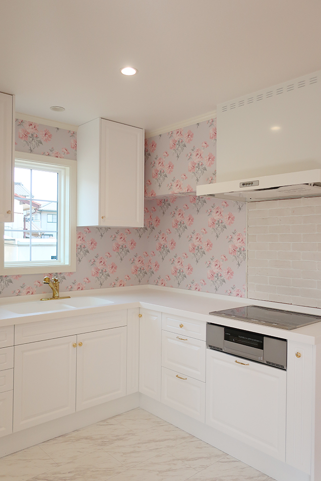 白で統一されたインテリアに、華やかなクロスを合わせたキッチン。 レンジ周りに貼られたタイルがとてもおしゃれ!
