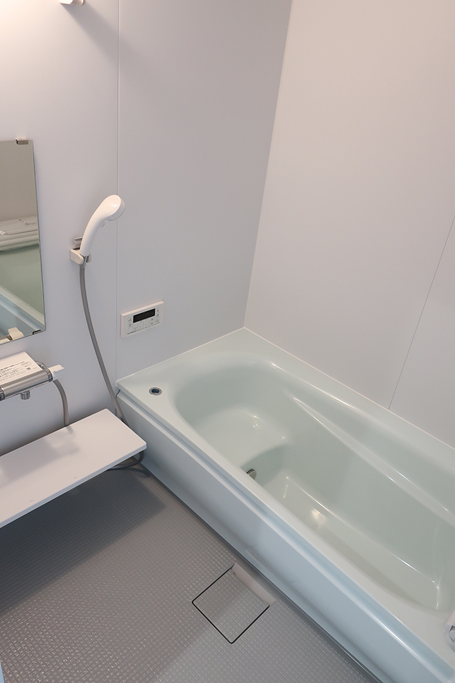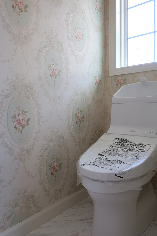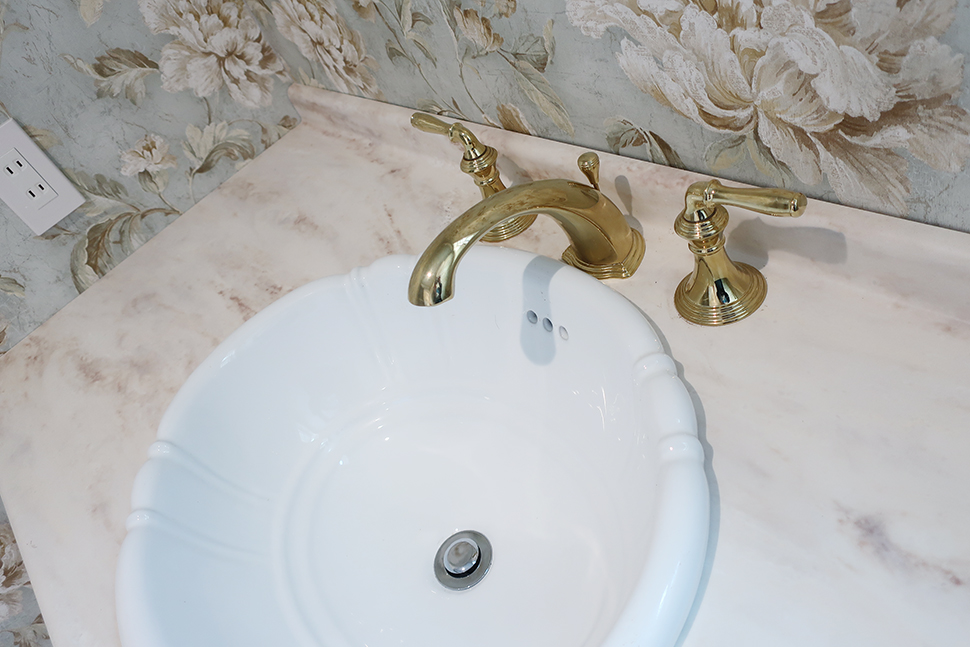 重厚感のあるレトロな雰囲気のクロスを使用した水廻り。 こだわりの洗面台との相性が抜群の、素敵な空間です。