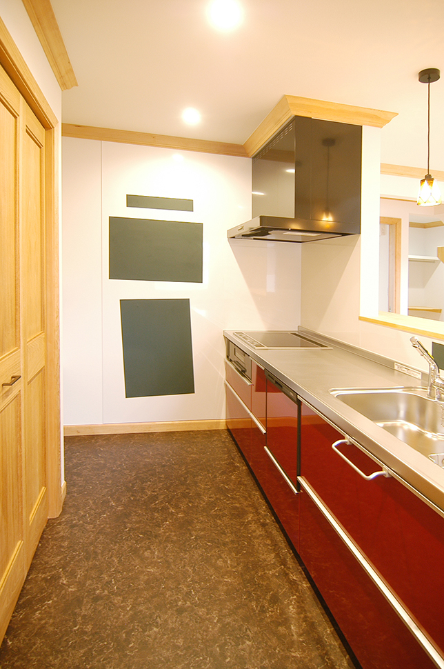 自然素材のあたたかな風合いに鮮やかなレッドが映えるキッチン。